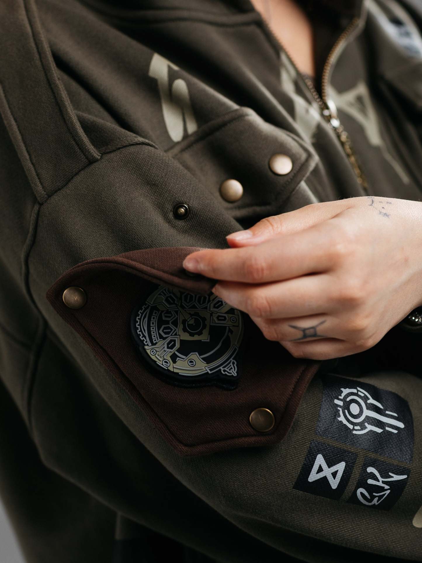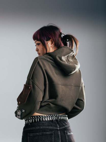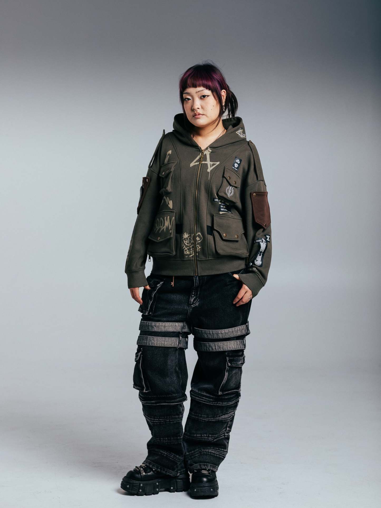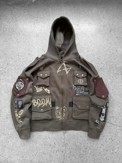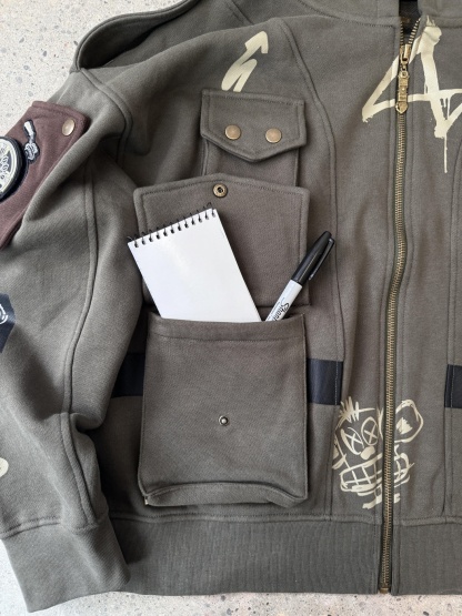 This is our classic zipup hoodie made of double-layer thick acid-washed French terry. Embroideries and prints on both sides. The hoodie has 7 pockets on the chest and sleeves. The hood has a full zipline. The left sleeve has a rubber patch embroidery
