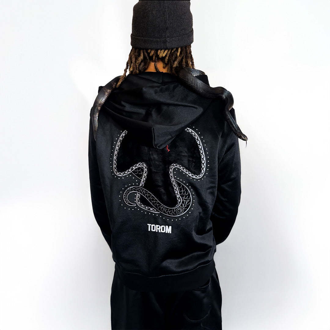 Immerse yourself in Torom's bold world with the Black Snake Jacket. A shimmering snake design on the back adds a touch of mystery to this elegant and original creation. A unique piece to express your individuality.