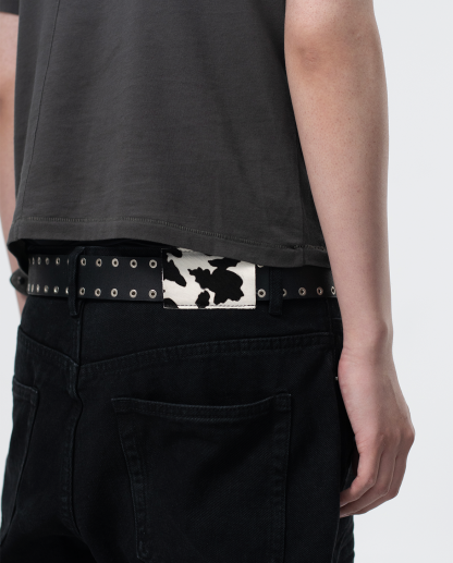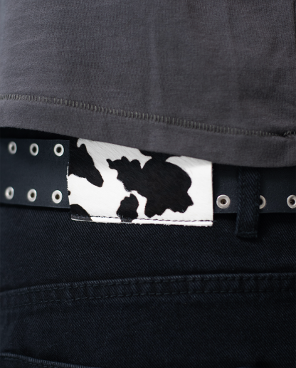 バックウエストにはカウ柄のハラコレザーパッチを使用。