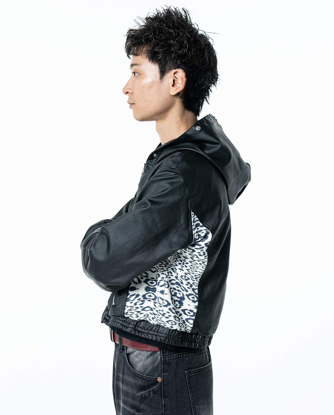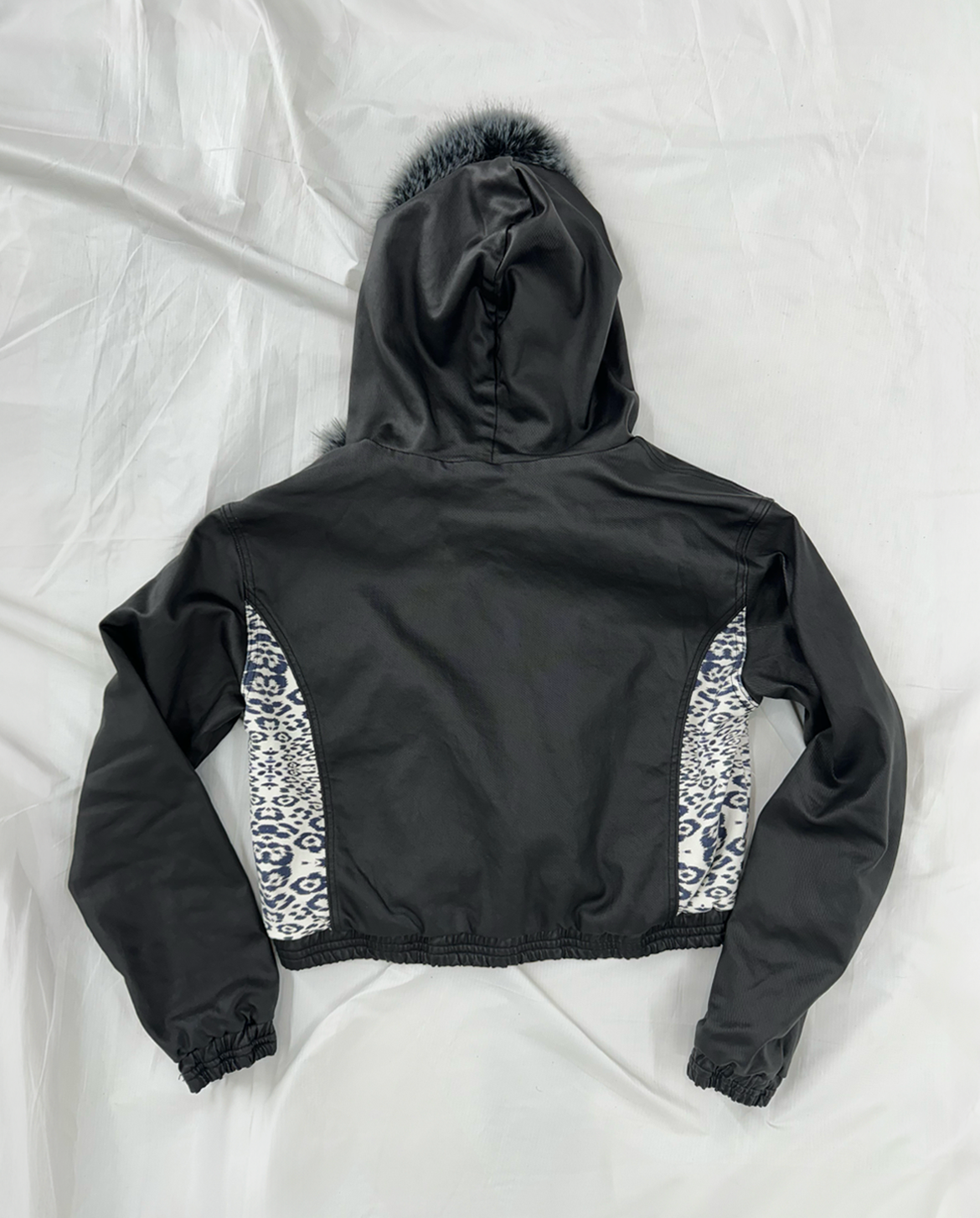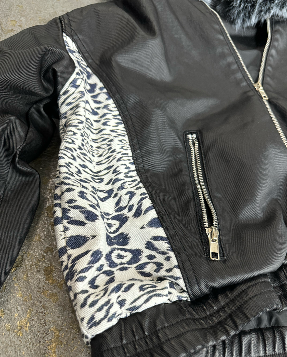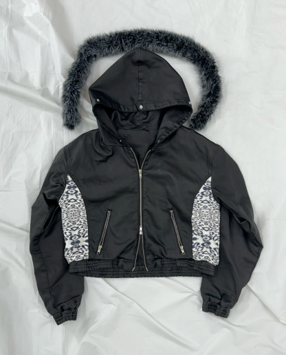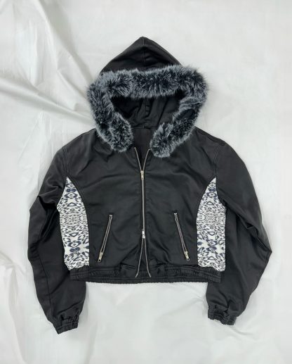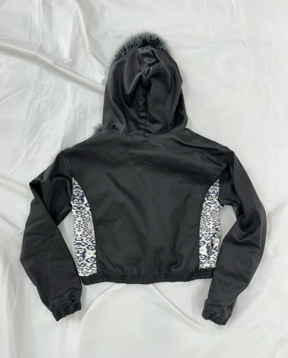 A standout feature of this jacket is the leopard print design on the sides, with each piece having a unique pattern placement, making it truly one of a kind.