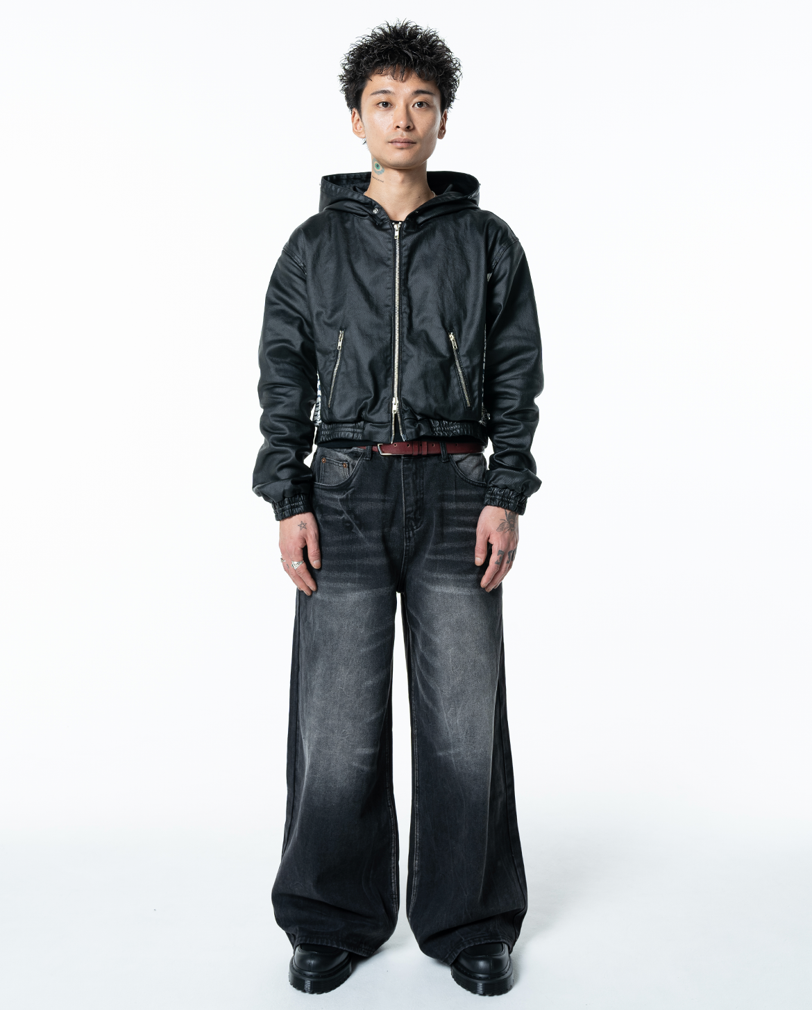 手作業でワックス処理を施したデニム生地を使用しているため、質感が際立ち、しっかりとしたシルエットが特徴。