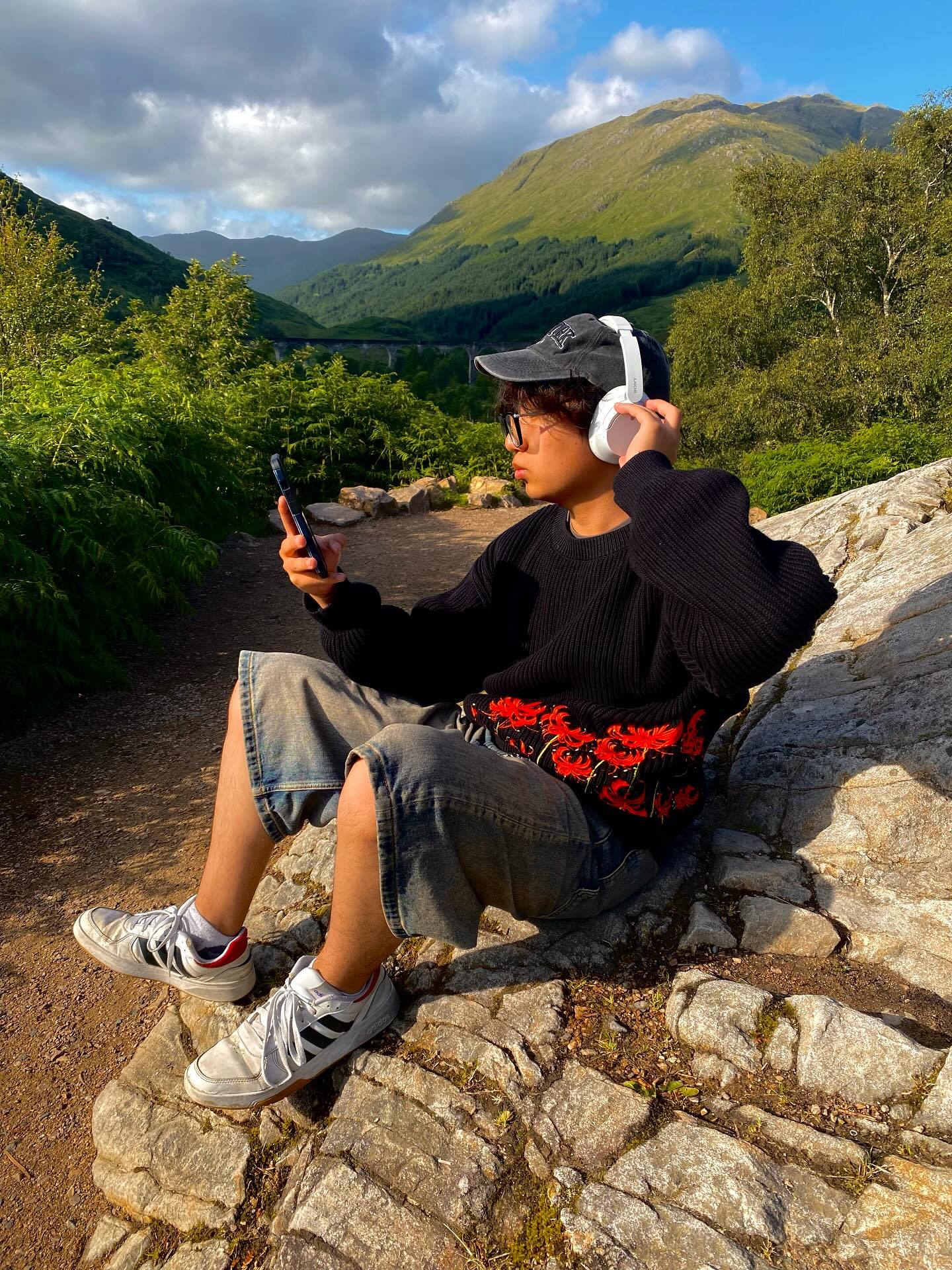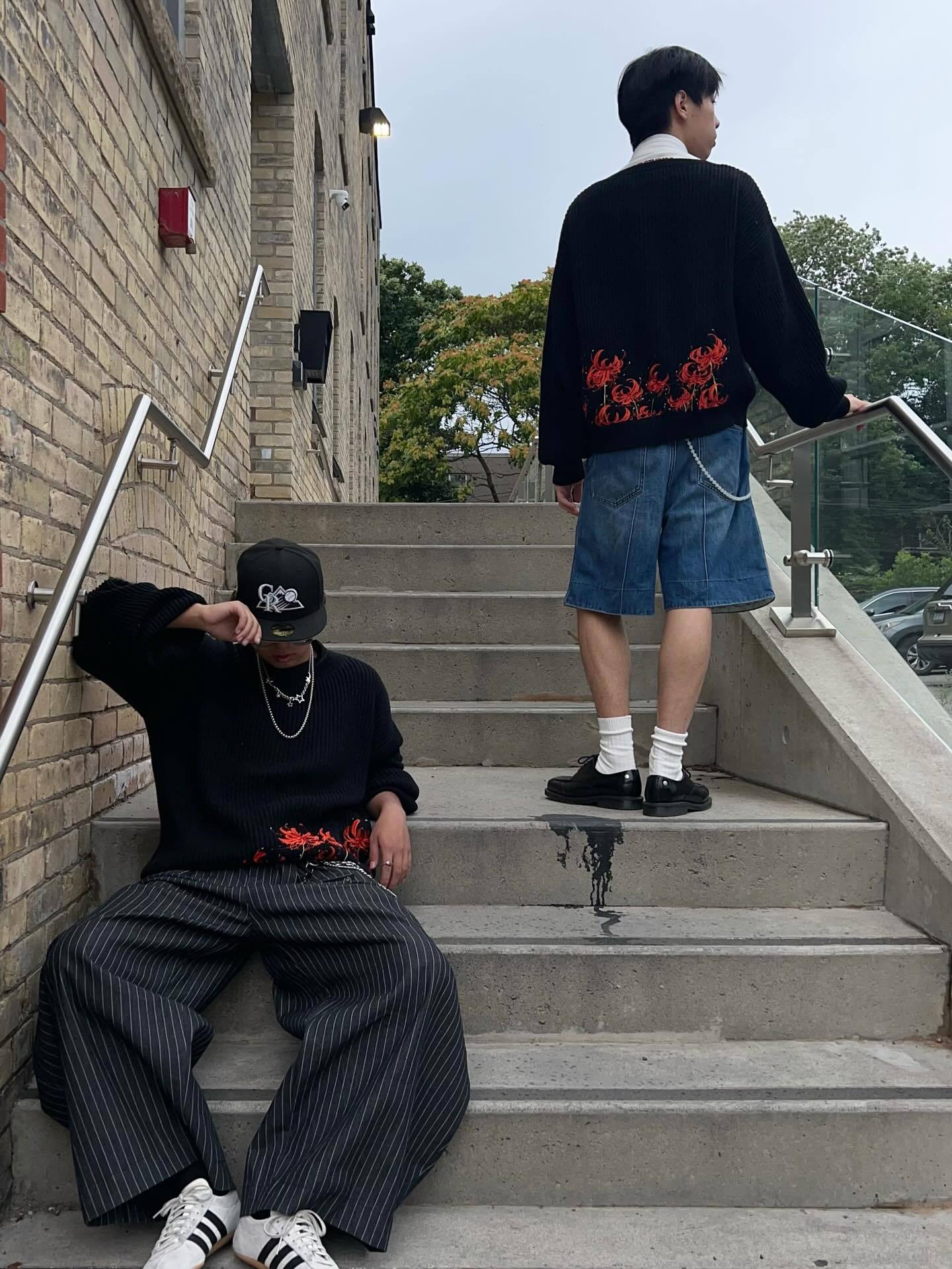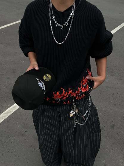 - Bold red floral embroidery pops on deep black knit.
